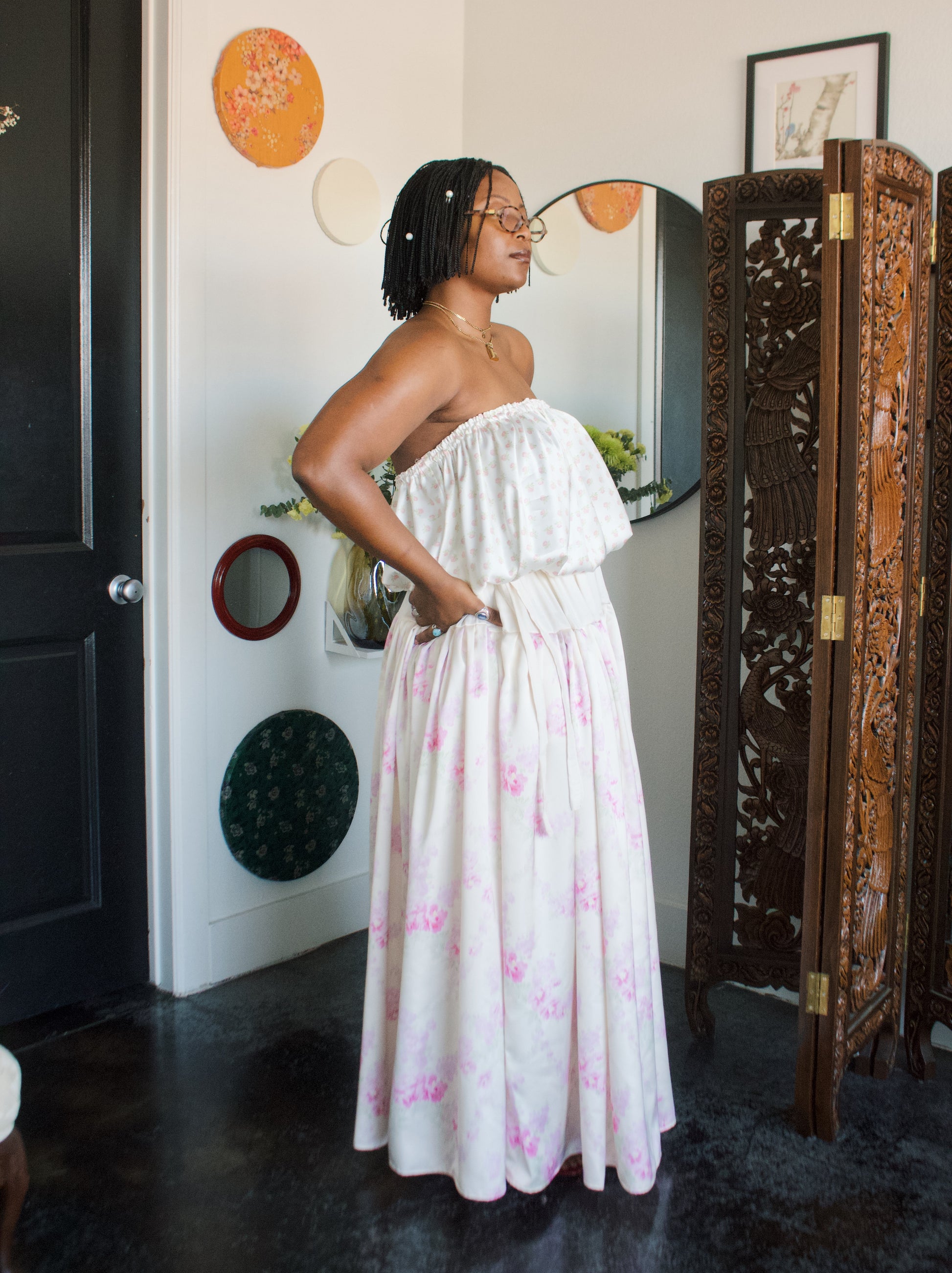 An expressive piece that with a playful yet refined spirit. A drawstring gathered bandeau pocketed tiered bubble dress. Adding on to our build your own piece collection.