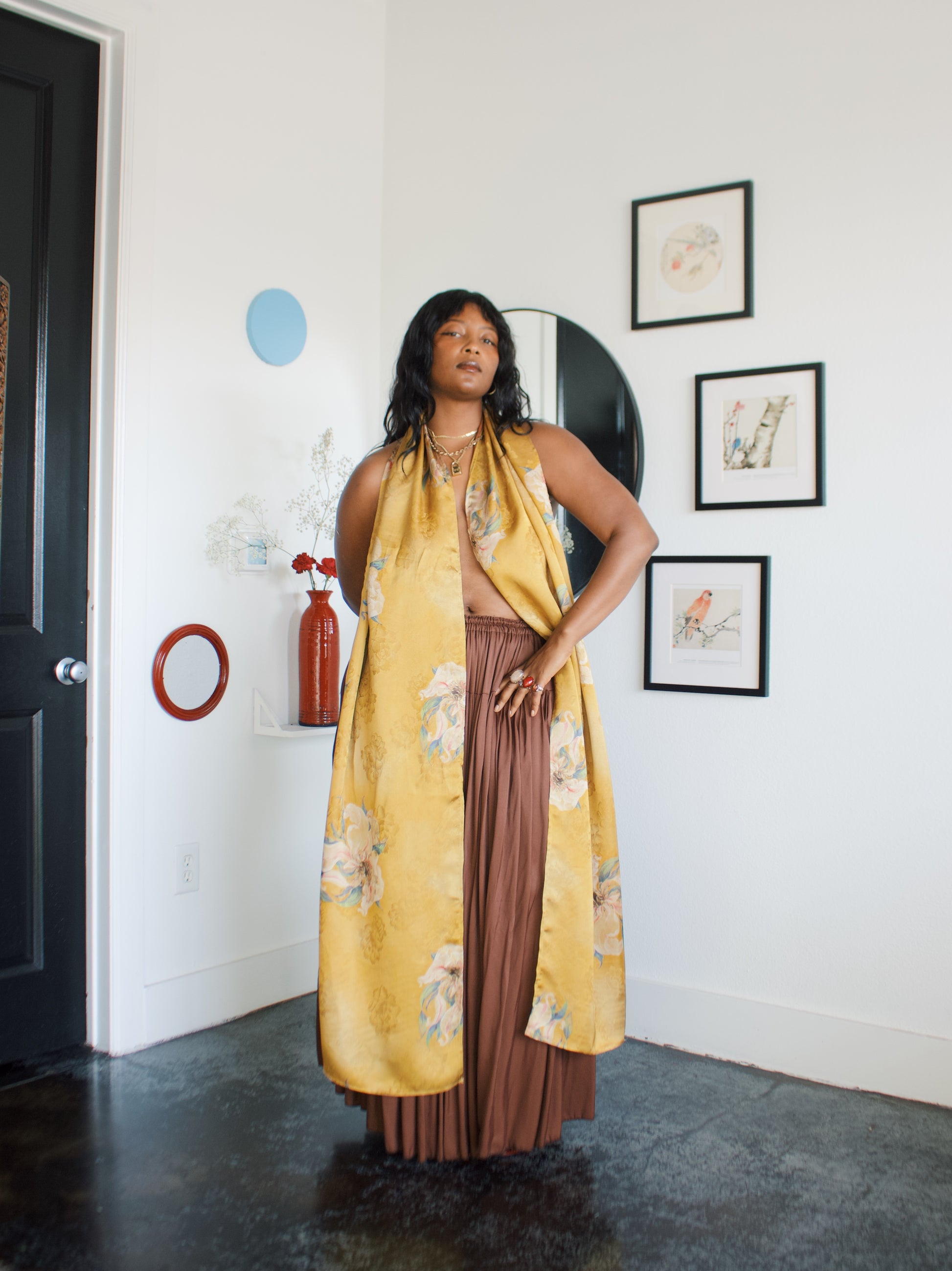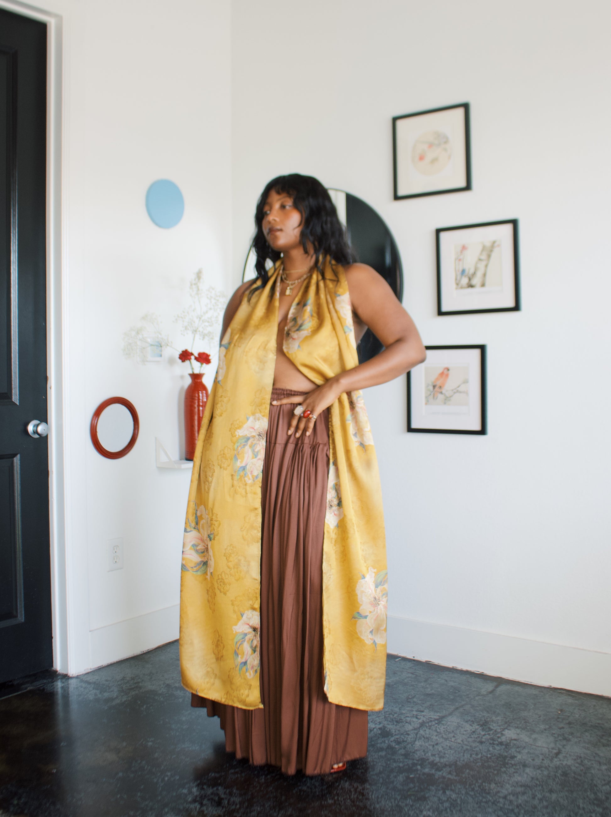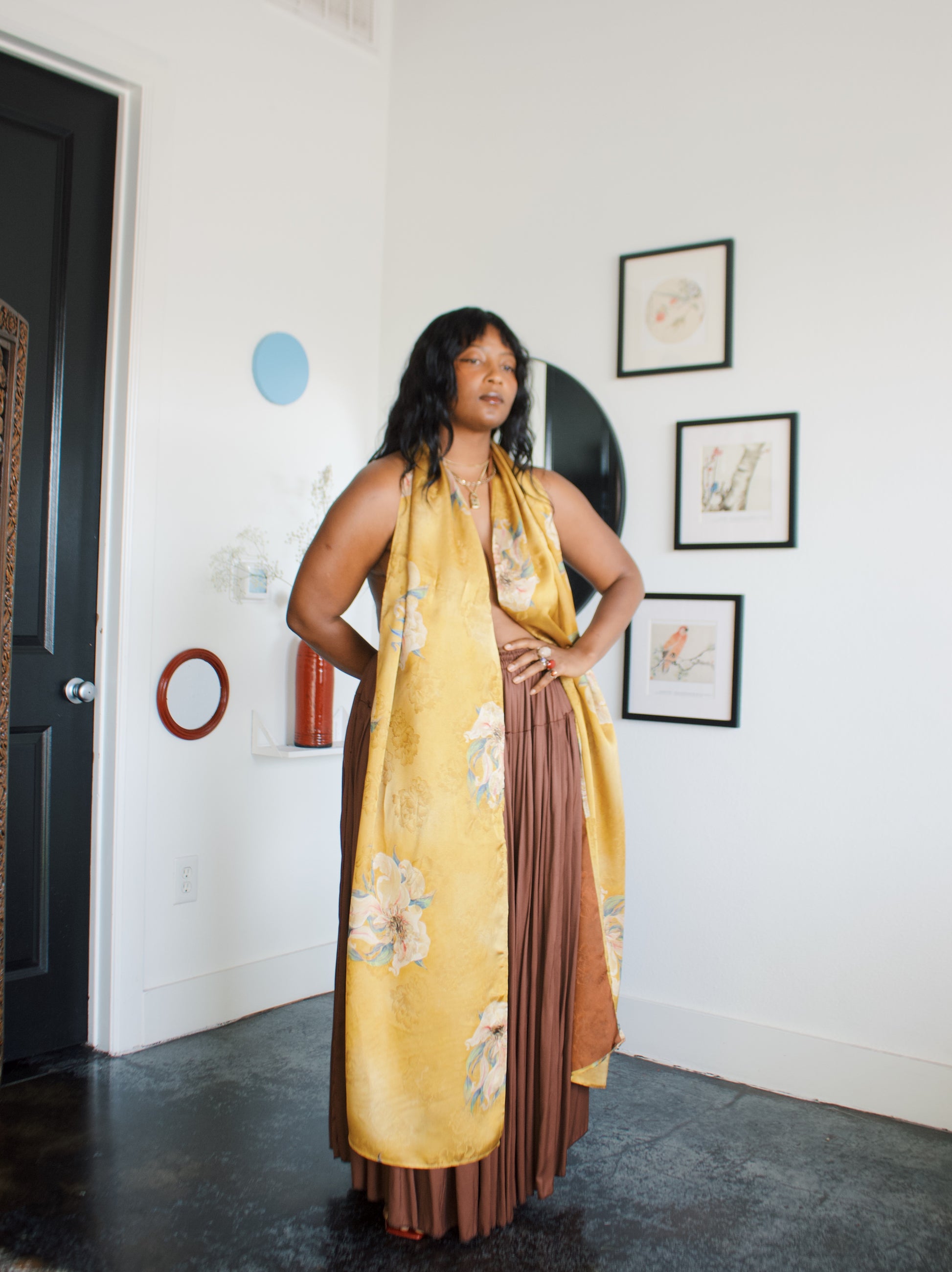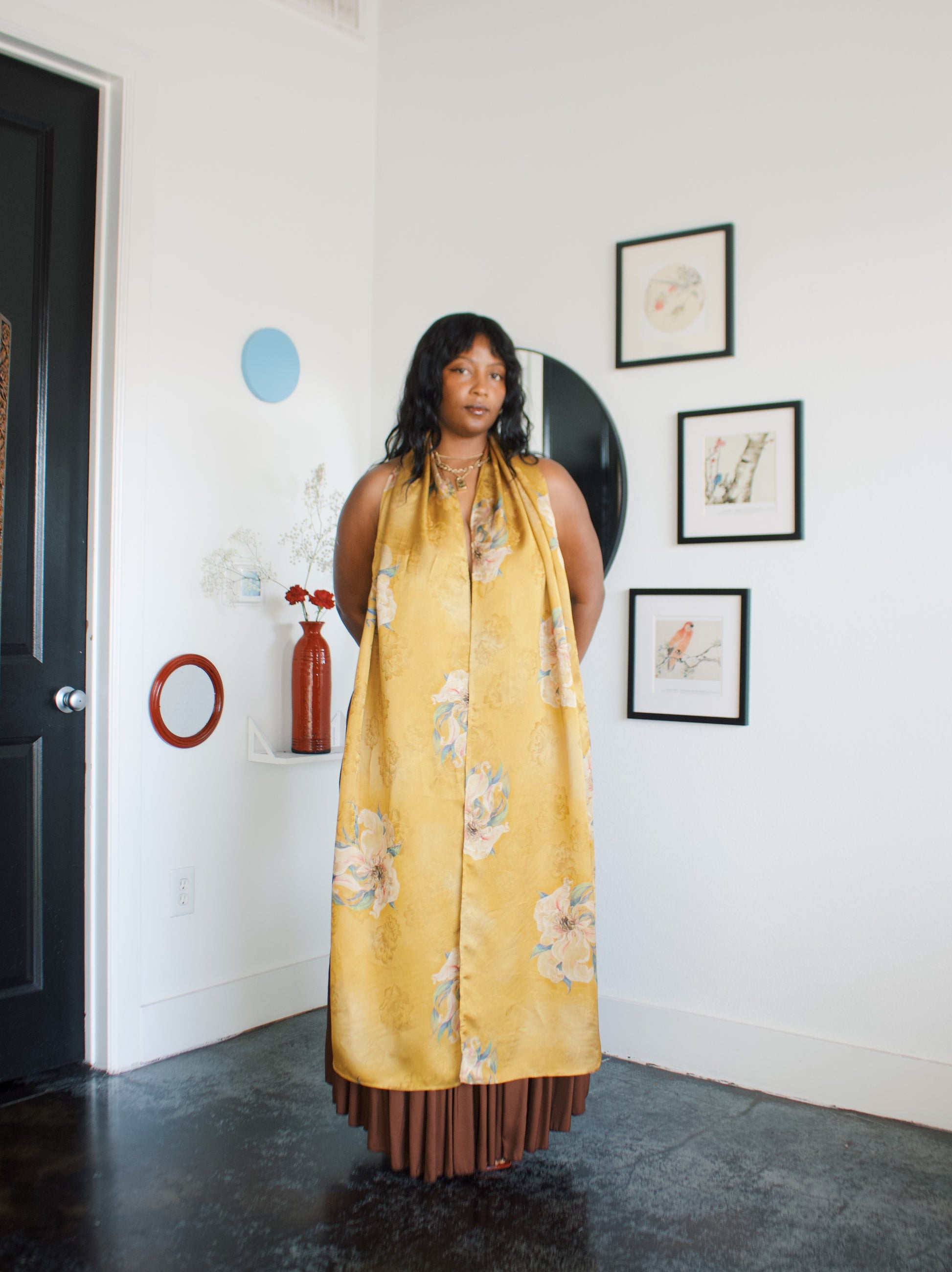 -Ofufueh is 5’7 and wearing Yellow Lilly in width 17 in length 108in