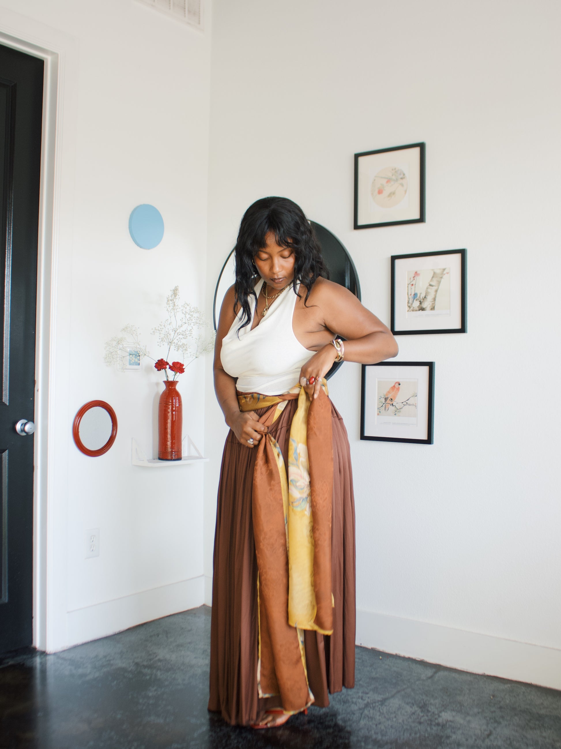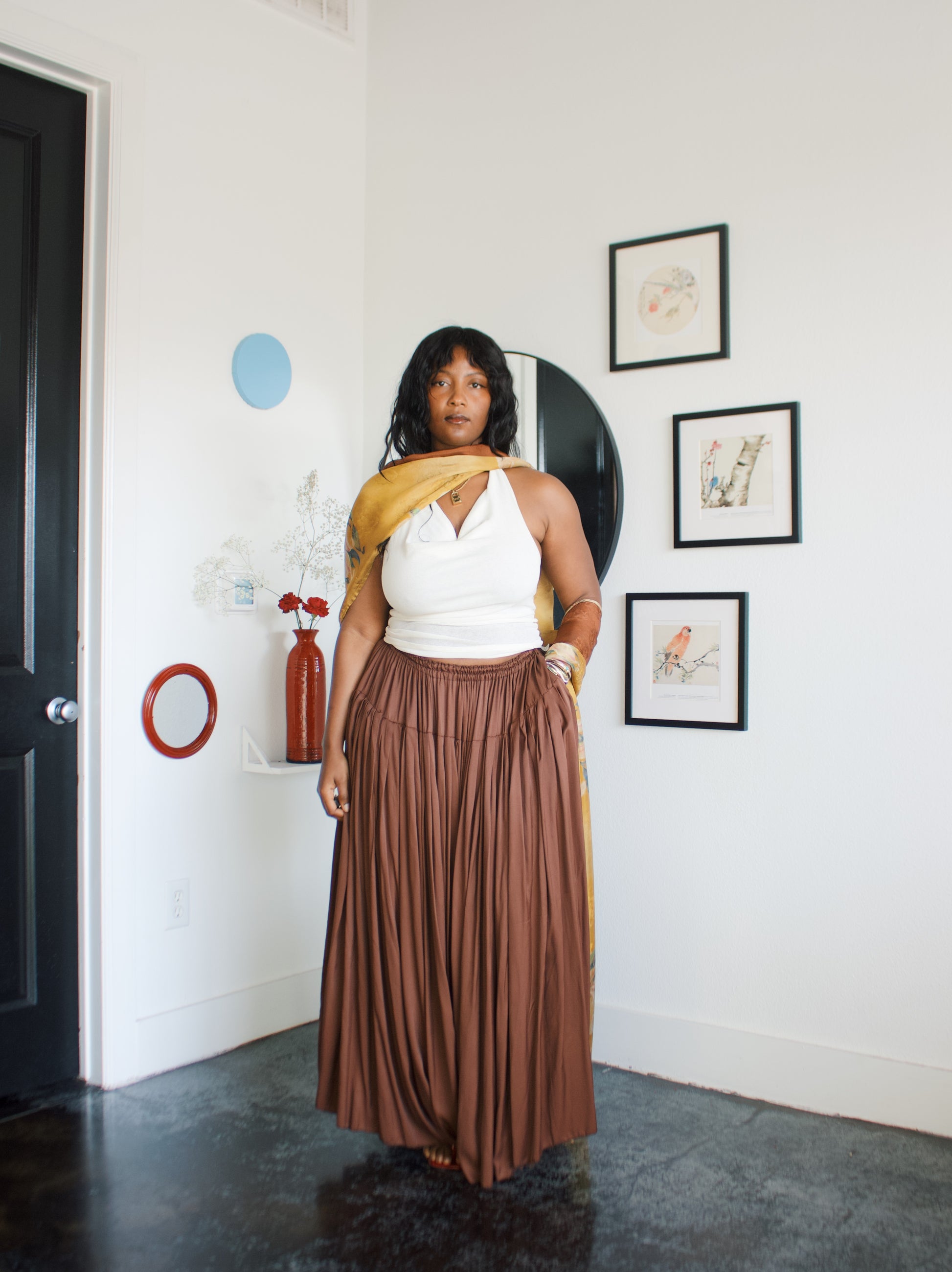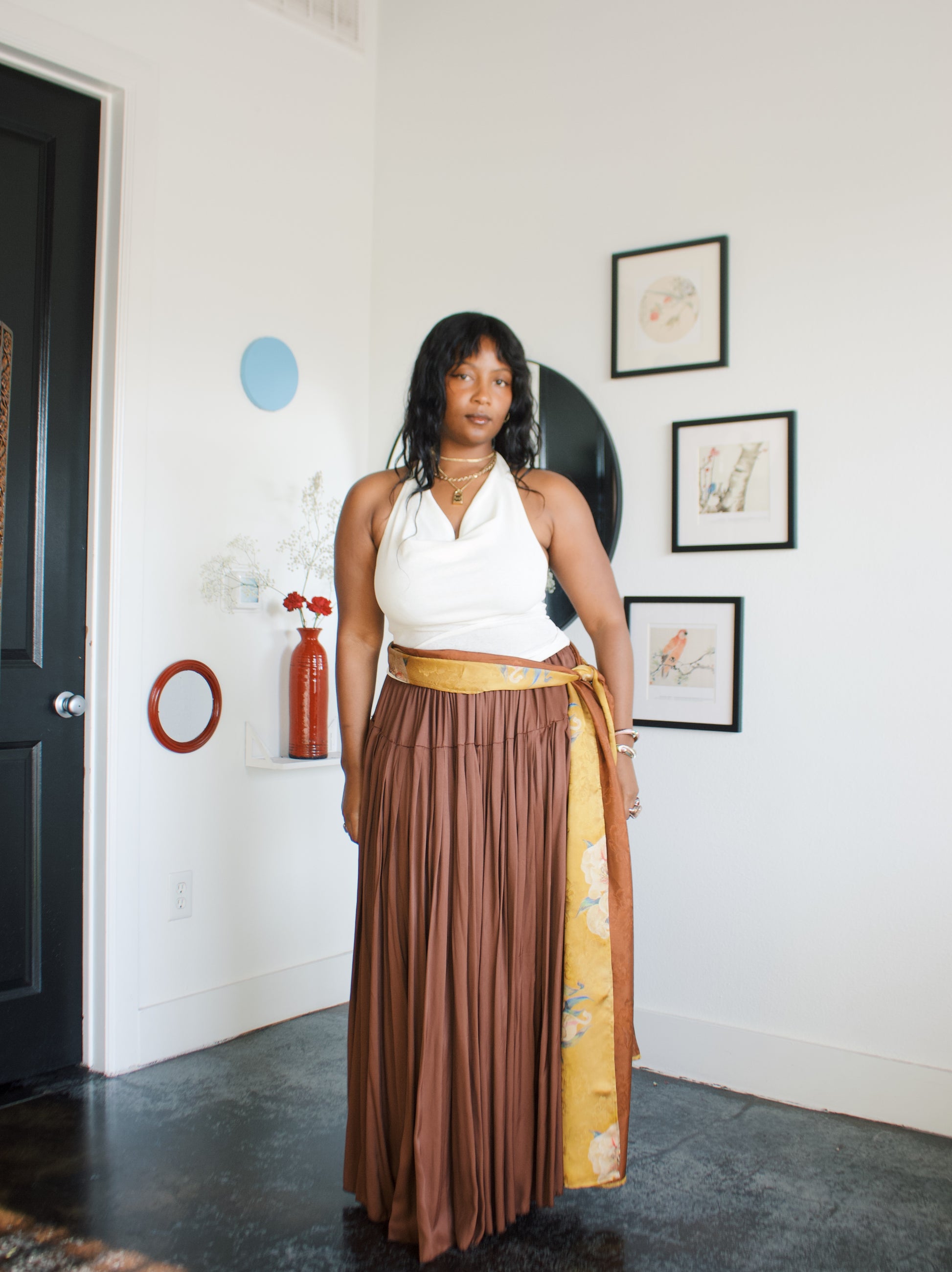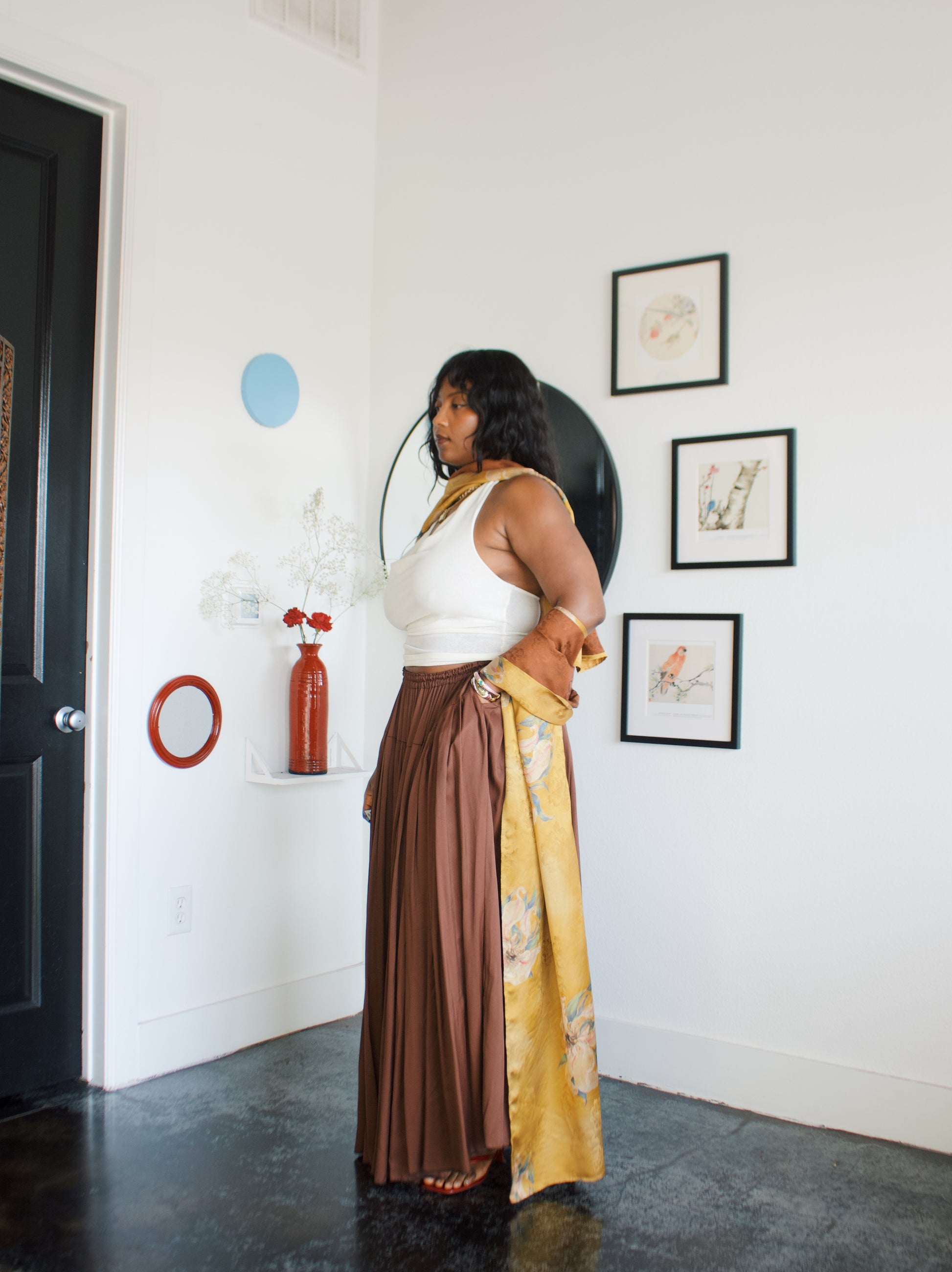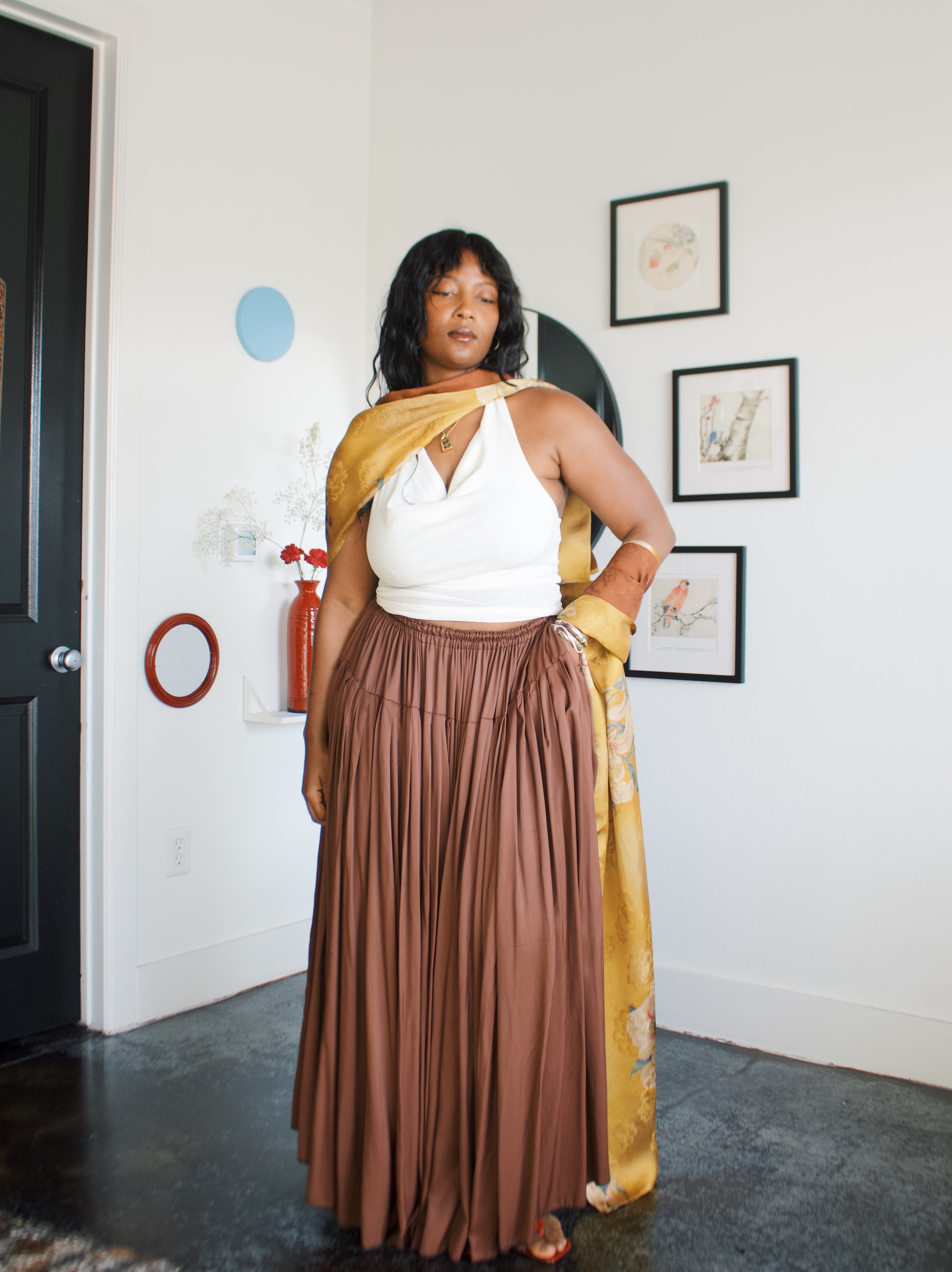 -Ofufueh is 5’7 and wearing Yellow Lilly in width 17 in length 108in