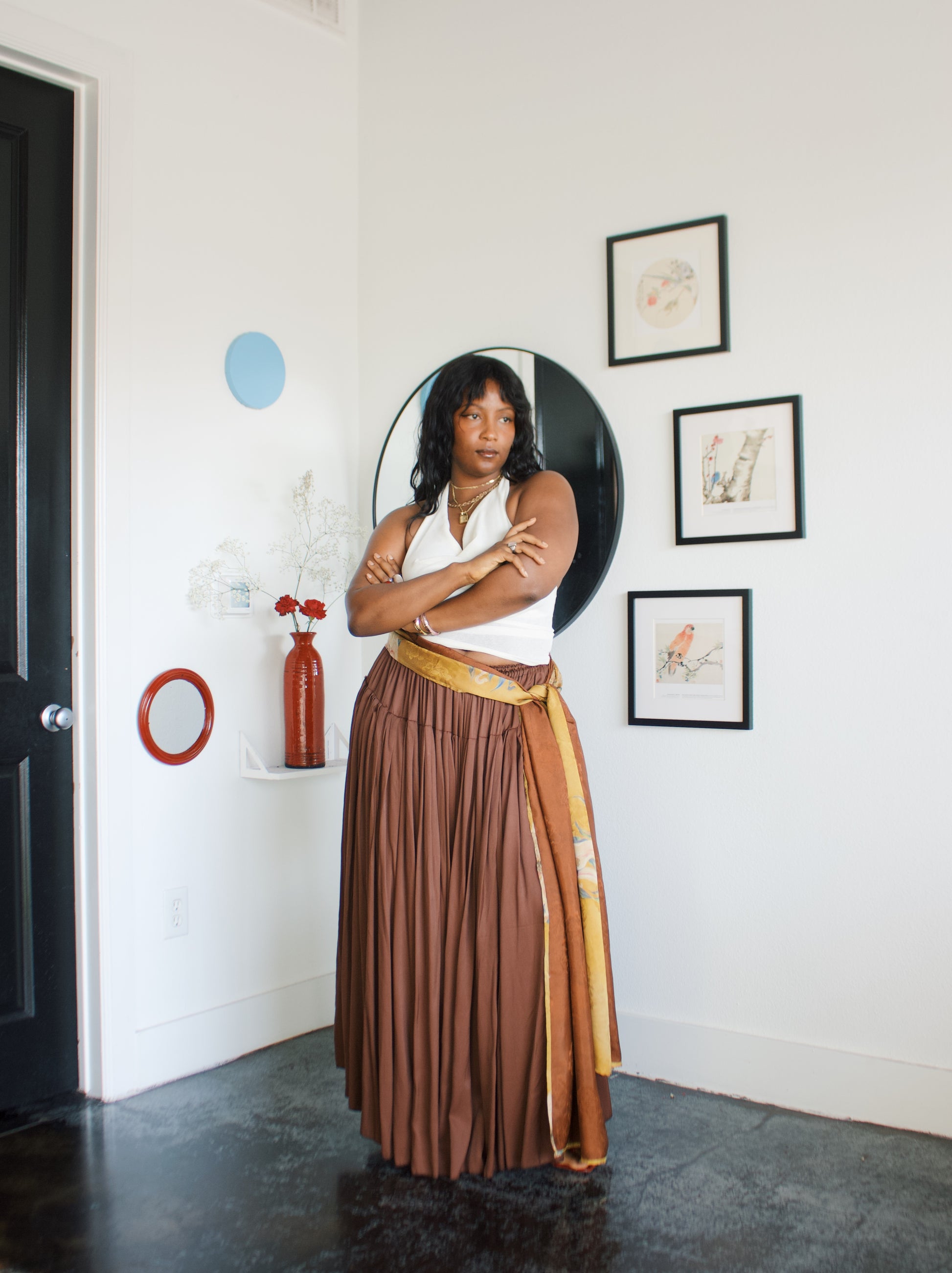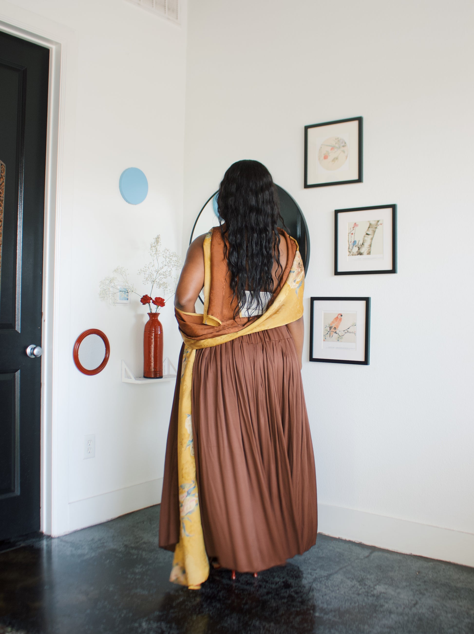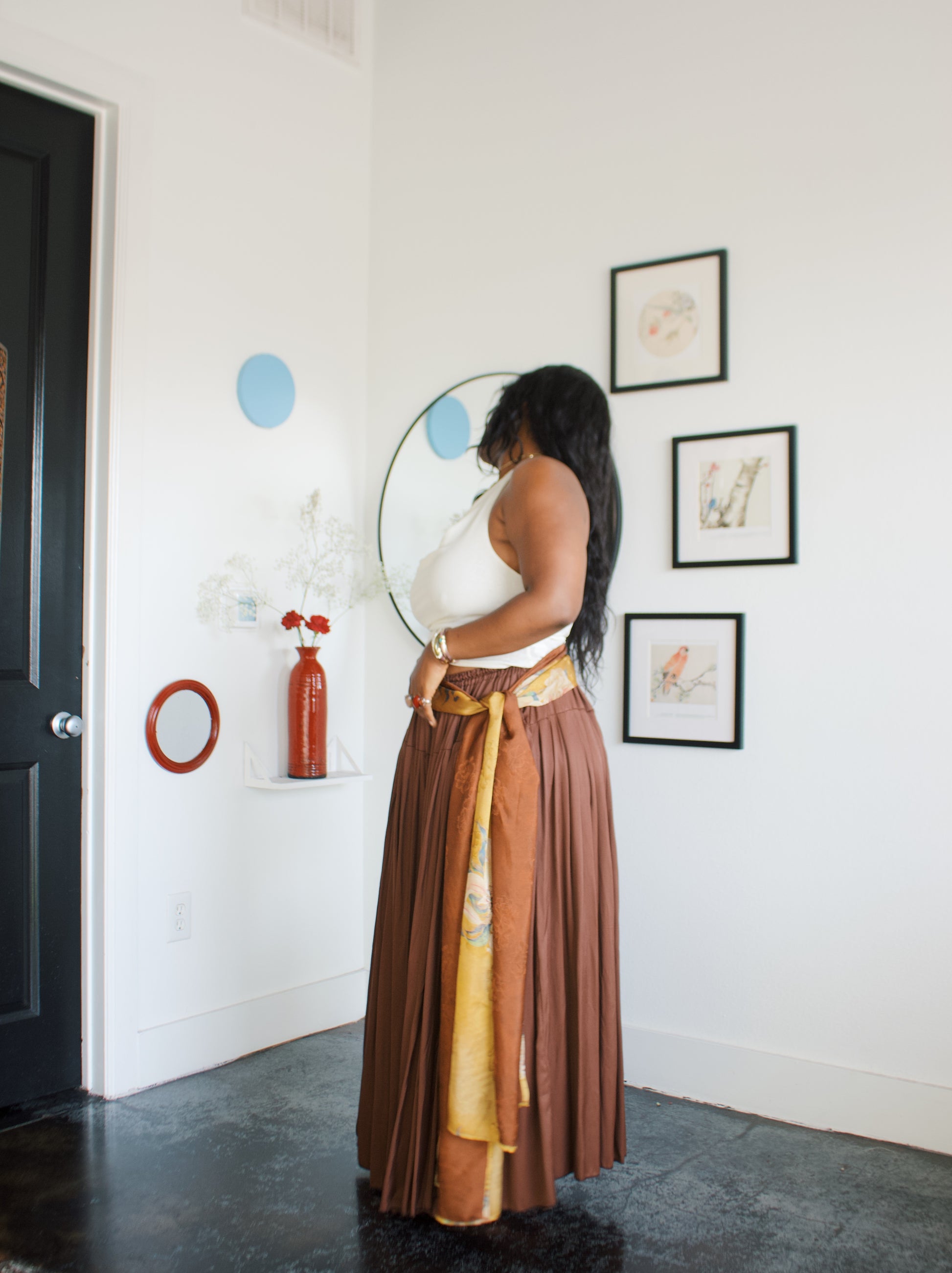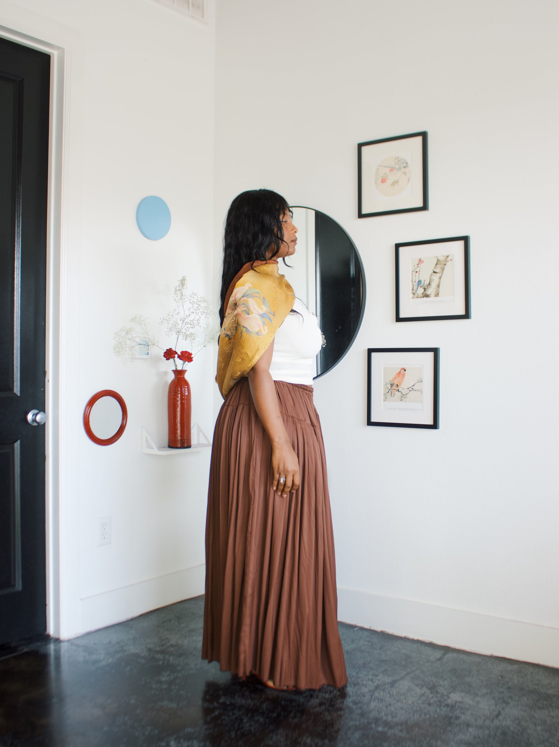 -Ofufueh is 5’7 and wearing Yellow Lilly in width 17 in length 108in